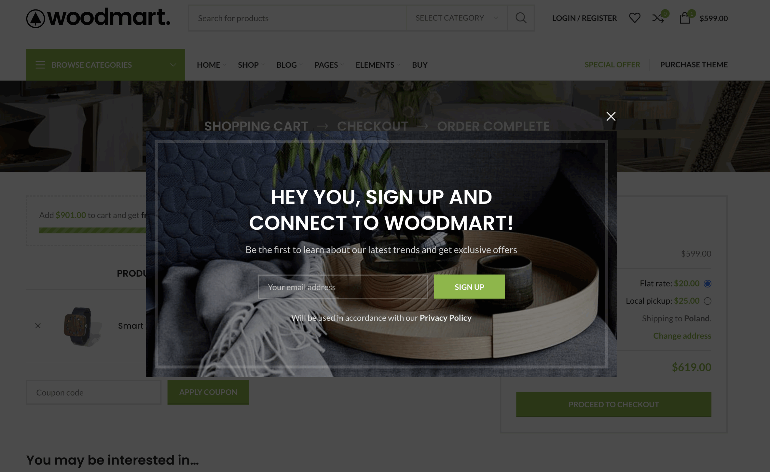 The Promo Popup feature in WoodMart theme allows you to display promotional messages, newsletters, special offers, or announcements to your website visitors through a customizable popup window. The popup can be triggered based on various user interactions and behaviors.
