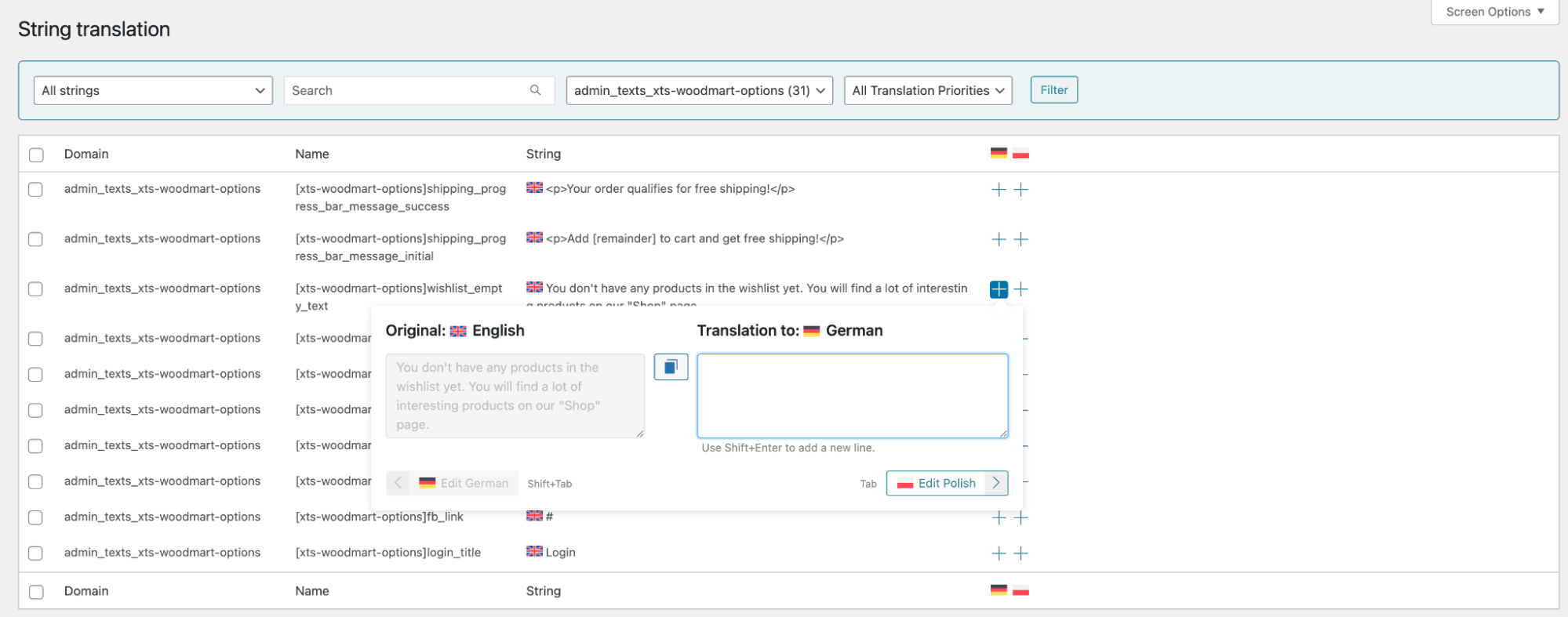 The WoodMart Theme Settings contain the replaceable text in the different tabs of the options, for example, Registration text in the Login/Register tab or Empty wishlist text in the Shop → Wishlist tab. All these texts are also provided in WPML → Strings Translations → Choose admin_texts_xts_woodmart_options in the “Select strings within domain” drop-down:
