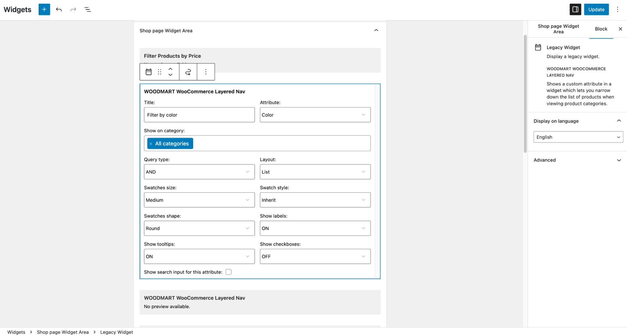 Widgets are configured in the Appearance → Widgets. All the information on types and areas of widget application is provided here: WoodMart Widgets and Sidebars