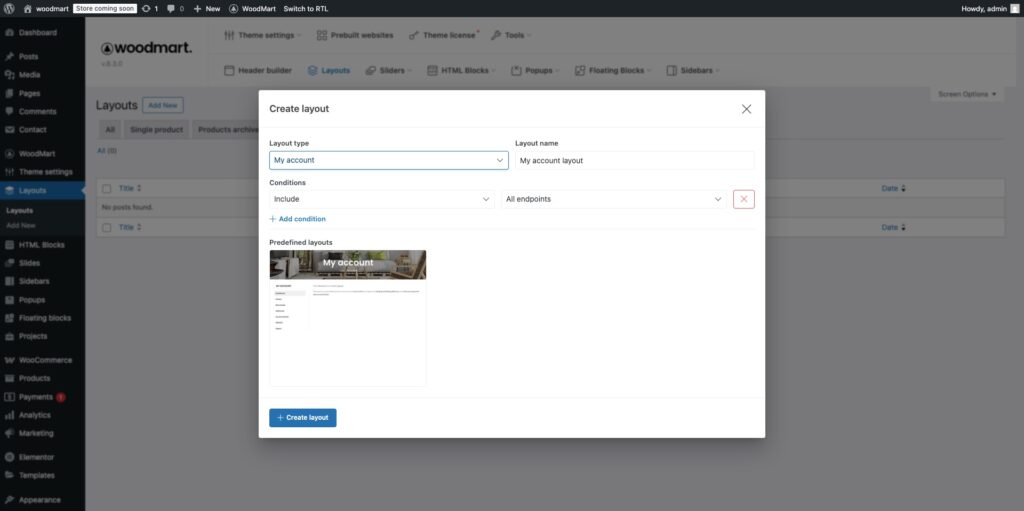 Step 2. Set layout type to “My account”, “Login/Register” or “Lost password” and write your layout name.