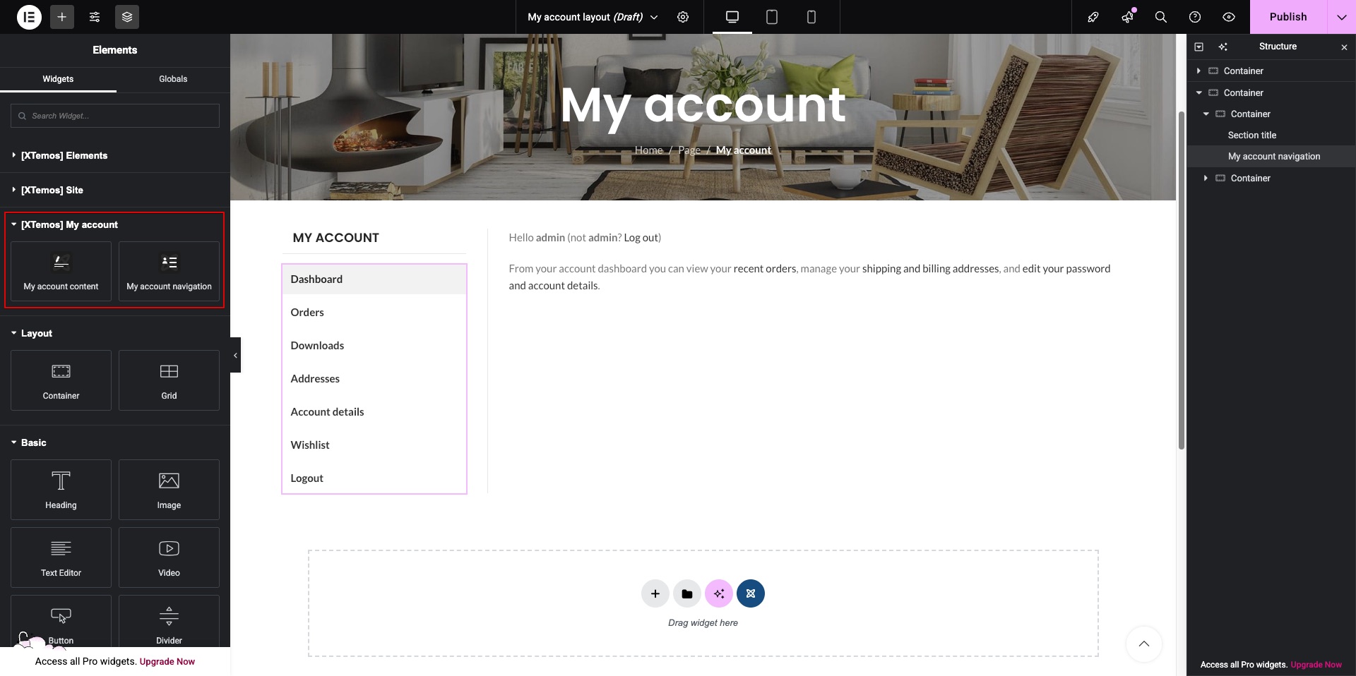 WoodMart My Account layout builder gives you complete control over your customer’s dashboard in WooCommerce. This powerful tool allows you to create unique layouts for all key sections, including the my account main content with navigation, login/registration page and password recovery form.