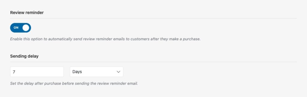To help you gather more product reviews, we’ve introduced the Review reminder feature. This tool provides a simple, automated way to send follow-up emails to customers after they’ve made a purchase. The feature includes a custom sending delay, allowing you to set the exact number of days after a purchase before the reminder email is sent. This ensures customers have had enough time to receive and use the product, making the review request more timely and effective.