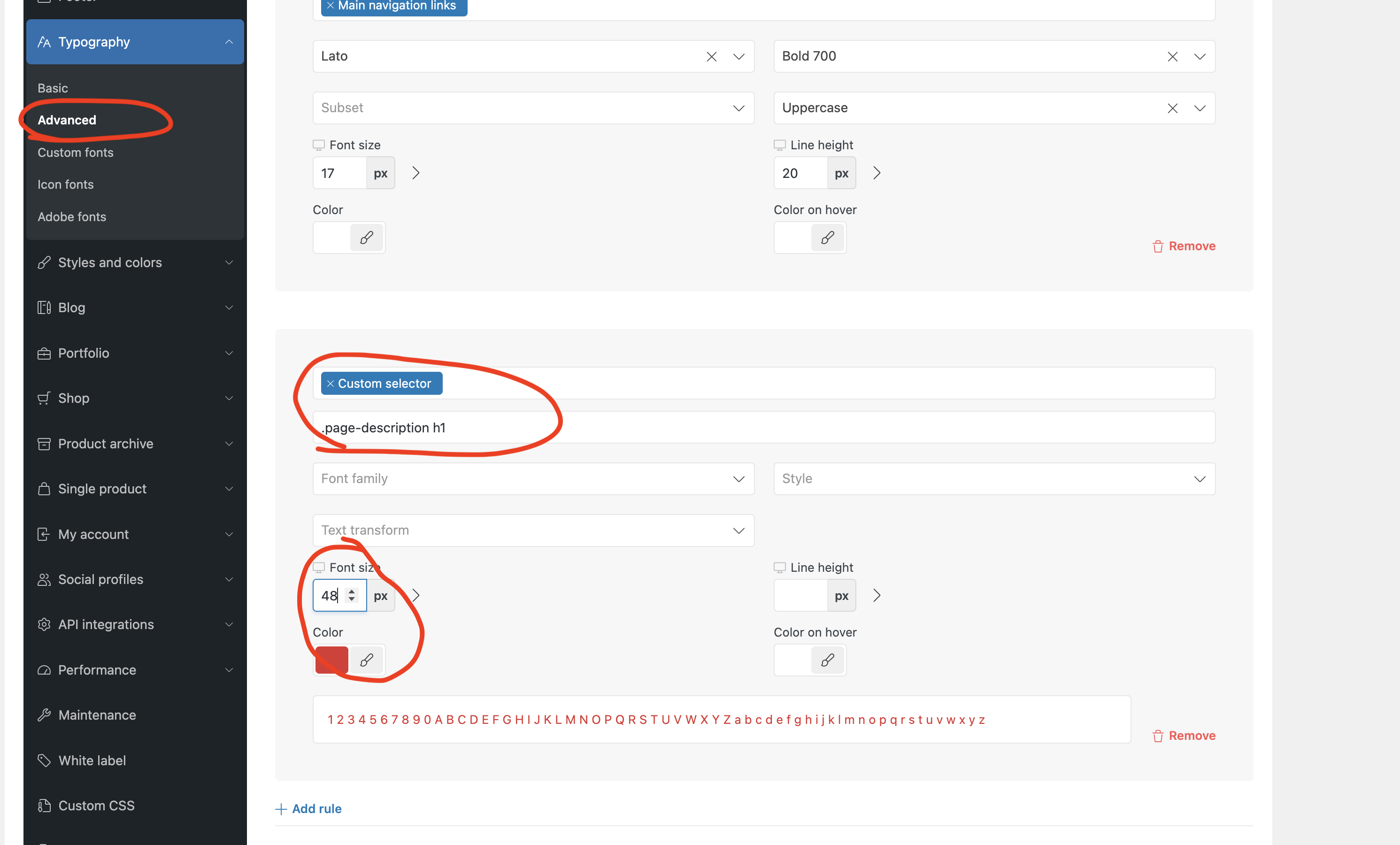 Now, about the typography settings. You can apply any font settings (size, color, font family and others) via Theme Settings -> Typography -> Advanced. There, you can use custom selectors as shown on the screenshot: