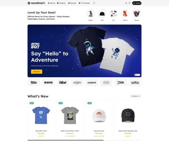 - Merchandise: Video game merch, collectibles, and fan souvenirs store with a bold, immersive UI.