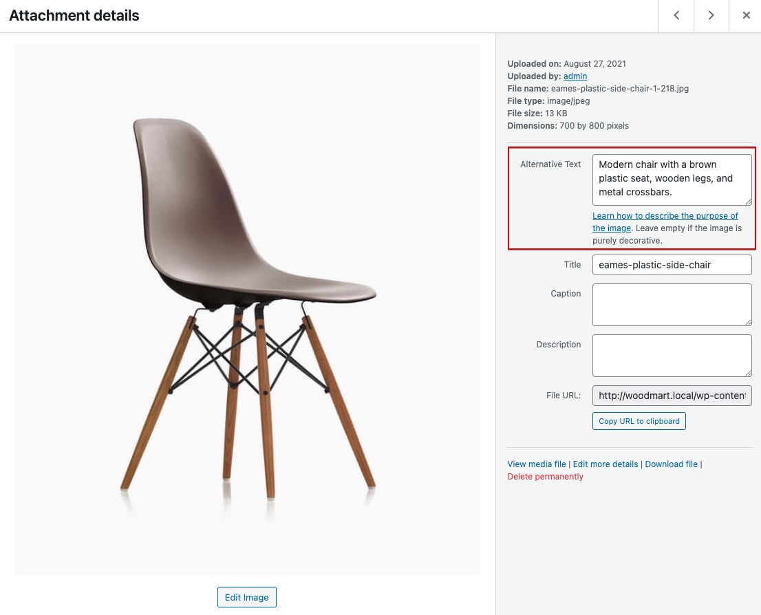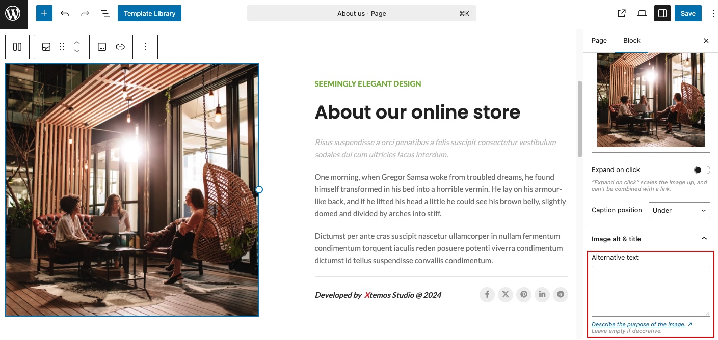 The changes described above can be made either by editing the HTML content directly or (depending on how the image is inserted into the page) by adding alt text to images through the dedicated field in the Media Library, as described in one of the previous sections. Additionally, since Gutenberg does not always inherit values from the Media Gallery, when using this builder, it is recommended to check the options of each individual element for specific settings that may contain fields for entering title, alt, or aria-label attributes.