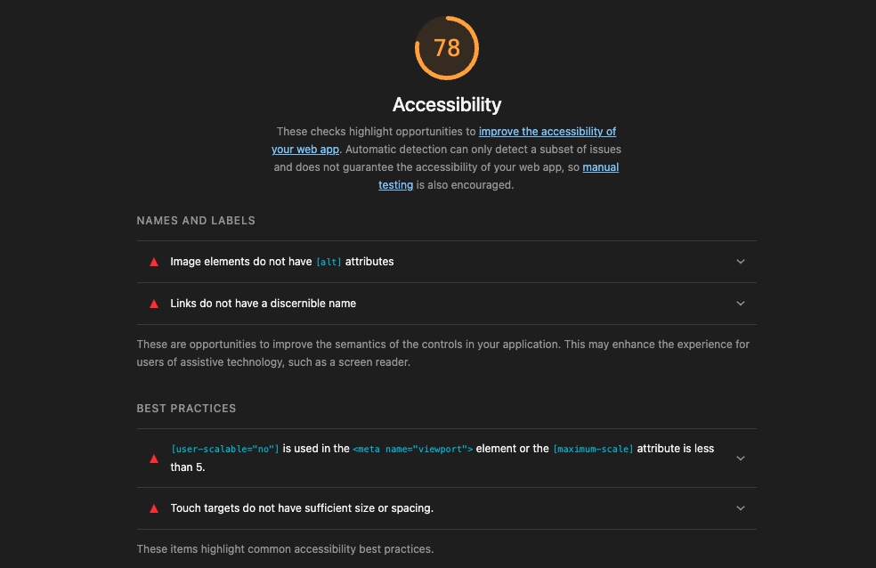 This means that interactive elements such as buttons, links, or icons are either too small or placed too close to one another, making it difficult for users — especially on touchscreens — to tap them accurately. This issue most commonly occurs on mobile devices, as tapping with a finger is less precise than hovering and clicking with a mouse. According to WCAG standards, touch targets should be at least 24px by 24px in size. If the audit shows that certain interactive elements are too small to be easily tapped, they should be repositioned or resized.