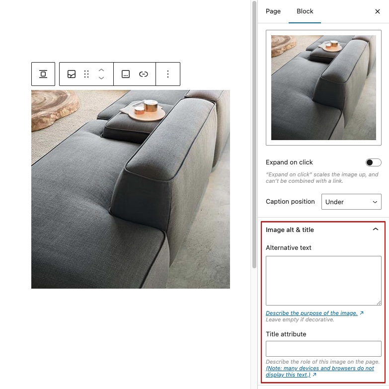 Some Gutenberg page builder blocks related to images (such as Image, Gallery, etc.) also have additional fields for setting the alt attribute directly within the block’s own settings panel.