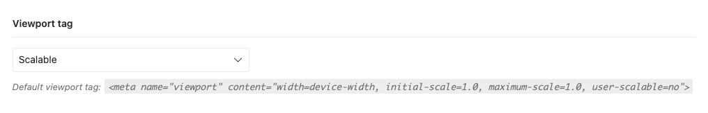 This indicates that the page restricts users’ ability to zoom or scale the content on mobile devices. This limitation negatively impacts accessibility because users with visual impairments may need to zoom in to read content comfortably. To remove the maximum-scale restriction and allow zooming on mobile devices, go to Theme Settings → Other, locate the Viewport tag option, and set its value to Scalable.