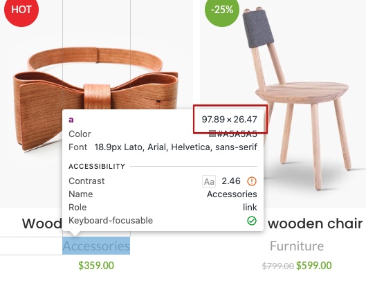 You can check the exact boundaries of each interactive element on the page by opening Chrome DevTools and hovering your cursor over the desired element. Its boundaries will be highlighted, and the size will be displayed in the corner of the tooltip overlay.