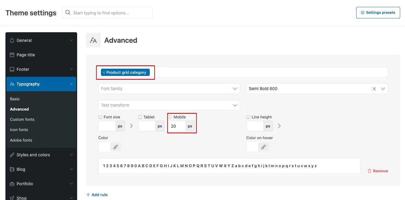 For example, if the audit shows that category links in the product grid are too small on mobile devices, you can adjust them using the Advanced Typography feature located in Theme Settings → Typography. In the typography interface, locate the “Product grid category” option and set an appropriate font-size specifically for mobile. It’s worth noting that inline text typically has a line-height greater than 1, which naturally increases the overall tappable area. Therefore, it’s not always necessary to set the font size to 24px — smaller sizes may still meet the recommended touch target area depending on spacing and layout.
