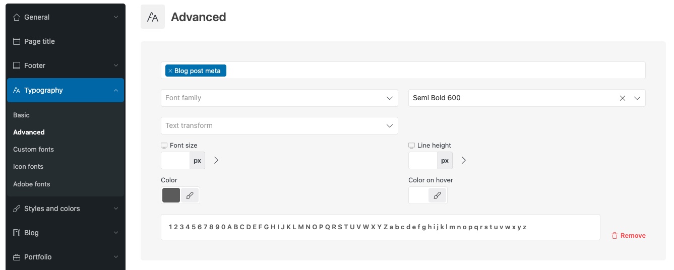 The most unique and specific elements — such as product categories in the grid, the old price in a discounted price display, blog post meta information, and others — can be found under Advanced Typography located in Theme Settings → Typography. For example, to change the color of the blog post meta information, go to the Advanced Typography interface, select Blog post meta, set the desired color, and save the changes.